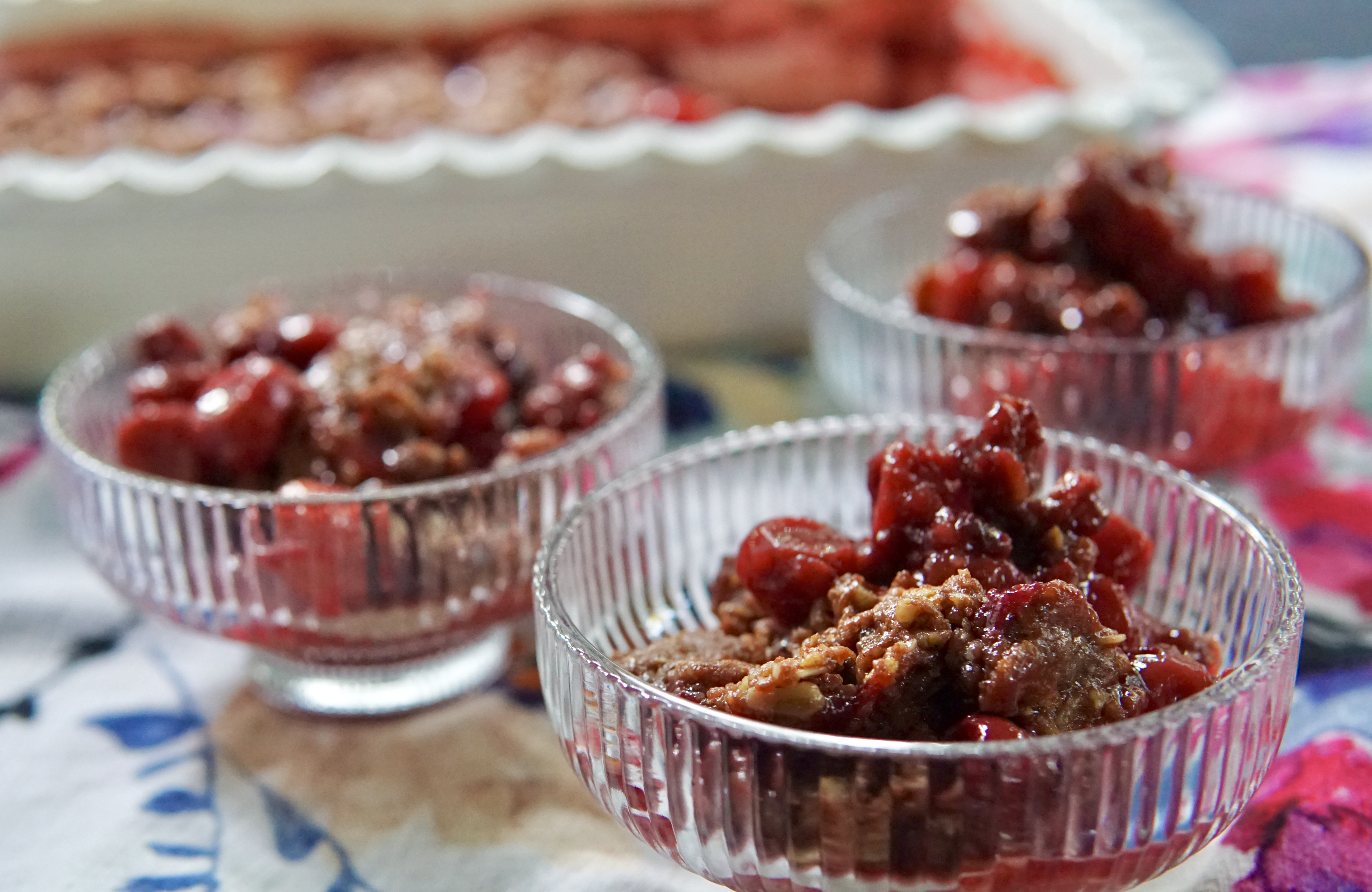 While the cherry filling is baking, prepare the crisp topping. In a large food processor bowl ( I love my Breville!), process walnuts or pecans and cornflakes until crumbly. Add oats, date syrup, almond butter, almond flour, date sugar, flax, and vanilla. Process well and set aside. (Mixture will be a bit stiff and sticky.)