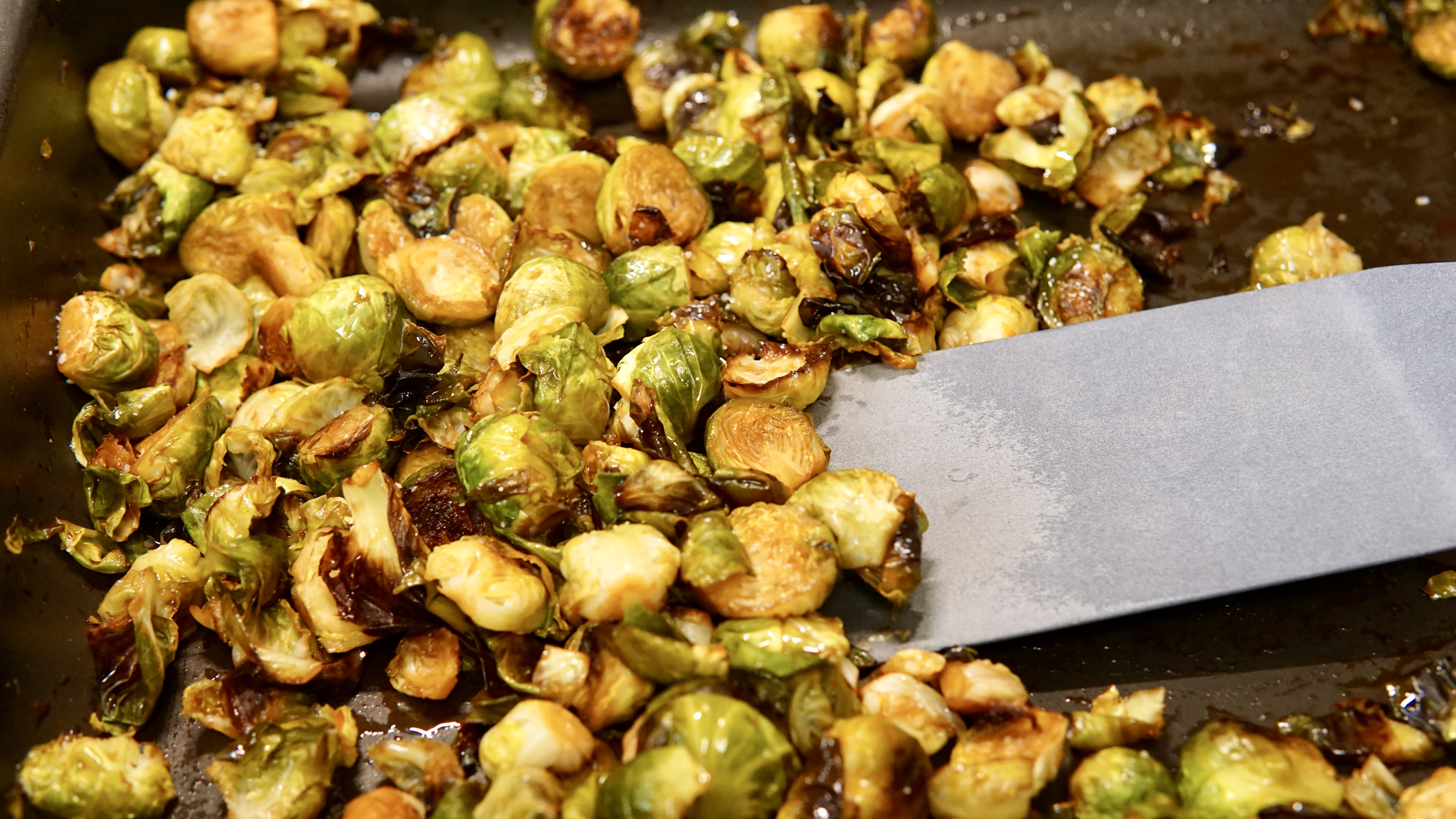 Remove pan from oven. Pour 1/4 cup (or more) water into the hot pan. Immediately stir the pan to allow the Brussels sprouts to evenly reabsorb a bit of moisture.